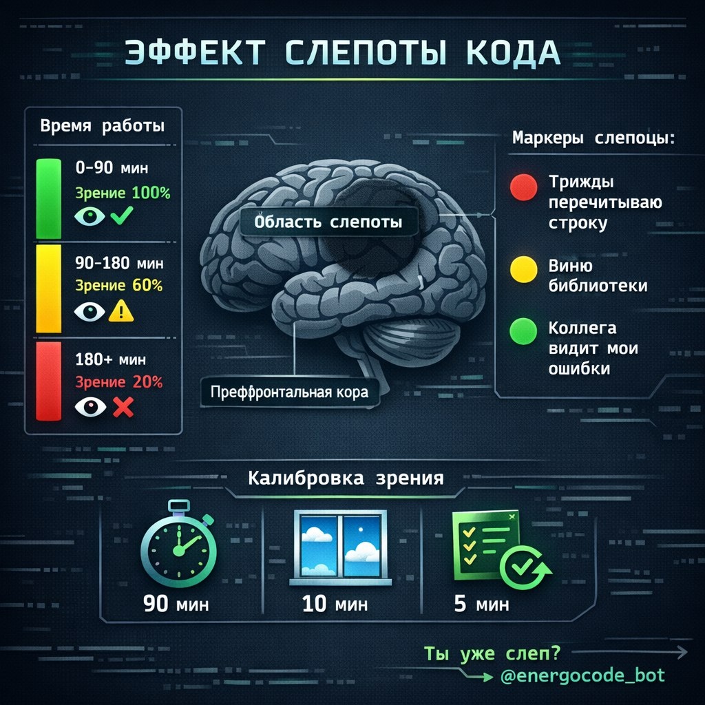 Вы часами ищете ошибку в коде, а она была в первой строке. Знакомо? Это «слепота кода» — когда мозг перестаёт замечать очевидное из-за перегрузки.