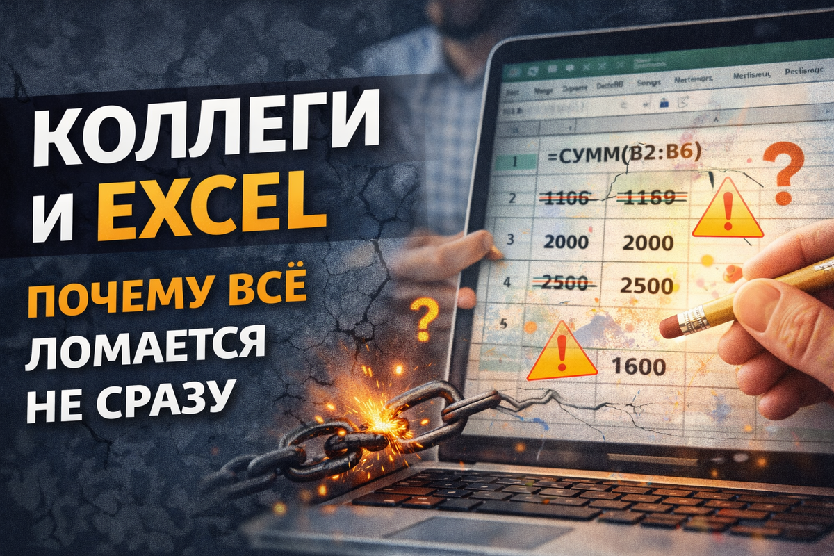 Часть 5. Коллеги и Excel: почему всё ломается не сразу. Почему Excel-файлы начинают давать странные цифры после совместной работы. Неочевидные причины поломок и как они накапливаются со временем. Excel редко ломается в момент, когда файл открывает другой человек. Он ломается потом. Через день, неделю, месяц. И именно поэтому источник проблемы почти никогда не находят. Почти все правки делаются с благими намерениями. — «Я только подправлю цифру»