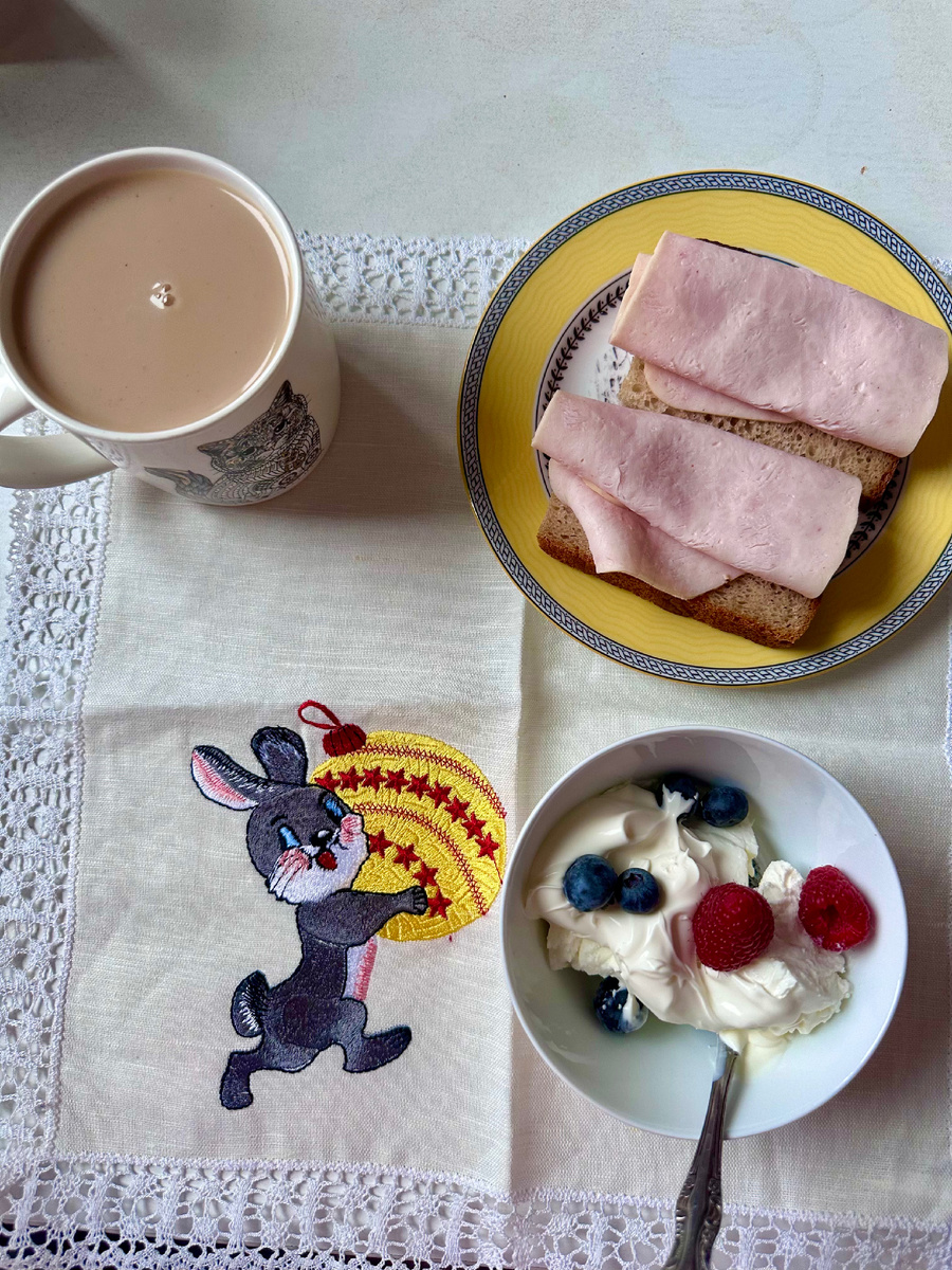 Кофе, творог со сметаной и пара бутеров с индейкой.