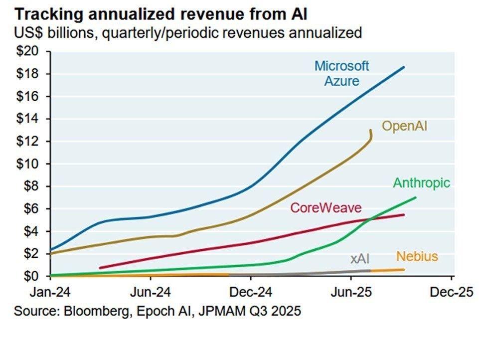 Призрака "пузыря" Третий квартал 2025 года ознаменовался значительным ростом доходов компаний, работающих в сфере искусственного интеллекта, что несколько ослабило опасения относительно формирования "ИИ-пузыря". 📈Лидеры роста: ➡️Microsoft Azure: Зафиксировала рекордную годовую выручку в размере 18,5 млрд долларов. Продажи удвоились со времени конца 2024 года и увеличились вчетверо по сравнению с началом года. ➡️Open AI: Главная звезда индустрии вышла на уровень 13 млрд долларов, что более чем в четыре раза превышает показатели начала 2024 года. 📉Аутсайдеры: 🔘xAI (Илон Маск) и Nebius: Годовой доход этих компаний пока не превышает 1 млрд долларов. Несмотря на крупные инвестиции в аппаратное обеспечение, монетизация мощностей происходит медленнее, чем у конкурентов.Несмотря на то, что разрыв между инвестициями в дата-центры и фактической выручкой (Revenue Gap) все еще вызывает беспокойство на рынках, текущие темпы роста OpenAI позволяют надеяться на успешное IPO в этом году с оце