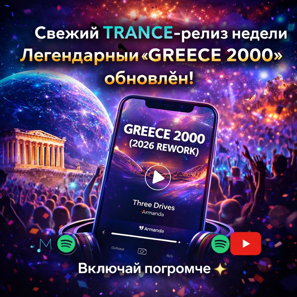 Легендарный гимн “Greece 2000” получил современный апдейт — обновлённый саунд, мощный дроп и фестивальный драйв, но с сохранением культовой мелодии. 🎬 Официальный клип: ▶️ https://www.youtube.com/watch?v=xw2_W6UVj0s 🎧 Слушать в Spotify: ▶️ https://open.spotify.com/track/1rO61T3jVwbokKW9F1CWBv Включай погромче. Транс снова звучит громко 🔊✨ Трек в комментариях!