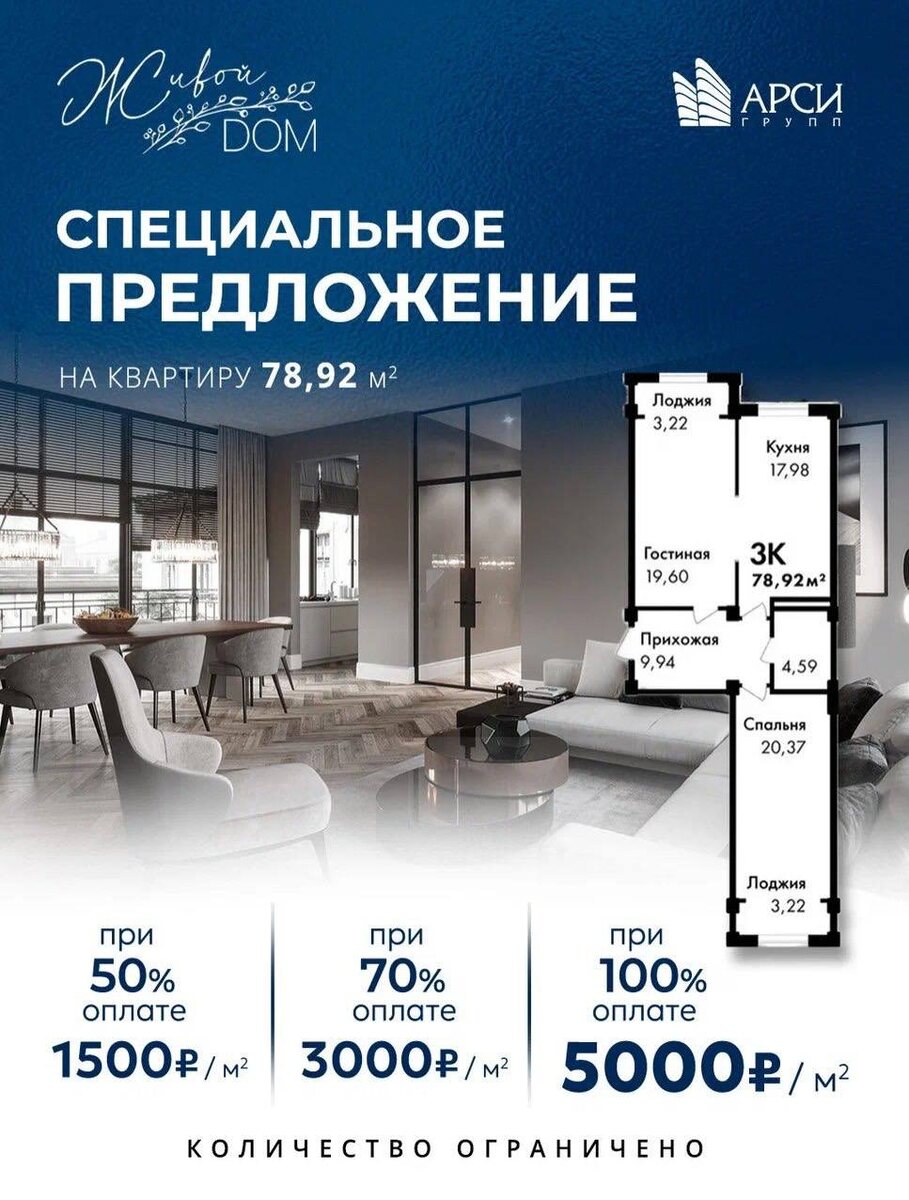 Квартира 78,92 м² с продуманной планировкой, светлой гостиной и лоджией — для комфортной жизни каждый день. ✨ Сейчас действует специальное предложение*: — 1 500 ₽/м² при оплате 50% — 3 000 ₽/м² при оплате 70% — 5 000 ₽/м² при оплате 100% Количество квартир по условиям ограничено. 📞 8 (800) 101-42-19 📩 Подробности — в отделе продаж.