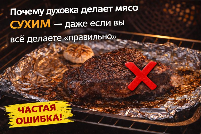 мясо высыхает под фольгой так же уверенно, как и без неё. Есть простой и рабочий подход. Ниже температура — дольше время. Пример: Если хотите корочку: Так вы не пересушите середину. После духовки мясо обязательно должно постоять: Если резать сразу: Если мясо из духовки сухое: Снизьте градусы.