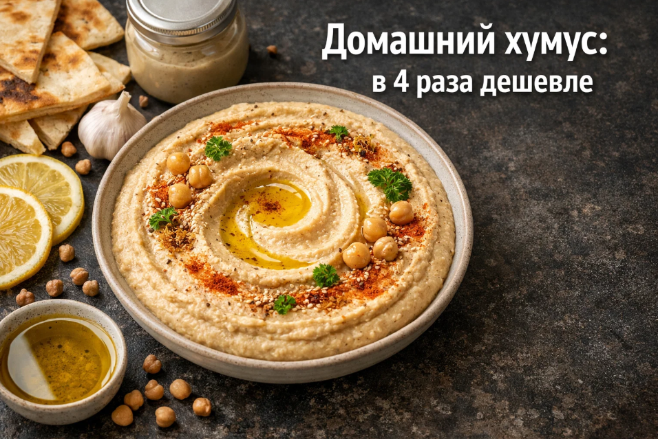 Итого на приготовление восьмисот граммов домашнего хумуса уходит примерно двести — двести пятьдесят рублей с учётом всех ингредиентов. Это получается около тридцати рублей за сто граммов против ста рублей и выше за тот же объём магазинного продукта. Разница в три-четыре раза — и это не маркетинговое преувеличение, а реальная математика.