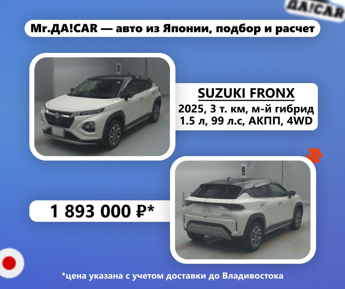 🇯🇵 #АвтоИзЯпонии #кроссовер #до2млн #до160лс 🚙 Suzuki Fronx, 2025 🇯🇵 - 1.5 л, 99 л.с., мягкий гибрид, бензин, АКПП, полный привод - Пробег: 3 000 км - Оценка: 4.5 🔆 1 893 000 ₽* — Итоговая цена под ключ до города Владивосток * с учетом текущего курса валют Хочешь такой автомобиль? — связаться с менеджером @mrdacar_help 📝 Дзен 📺 YouTube 🌐 Наш сайт 💙 ВКонтакте 📧 Почта для связи: MrDaCar@yandex.ru 💫 Есть вопросы? Позвоните нам — 89246840004 (Telegram, WhatsApp)