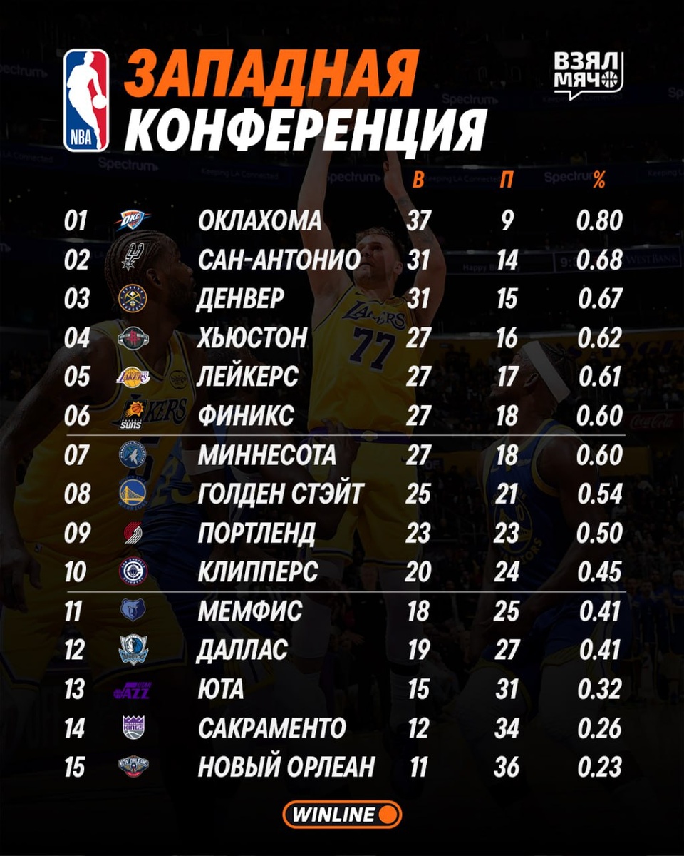 Таблицы Западной и Восточной конференций НБА. Как обстоят дела у твоей команды? Пиши в комментариях 👇🏼