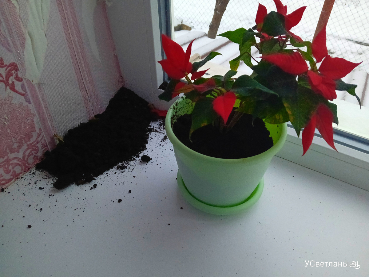 Утром, проснувшись, я немного расстроилась, увидев на подоконнике опрокинутый горшок с цветком. И кто его опрокинул? Конечно, наша хулиганка Машка.