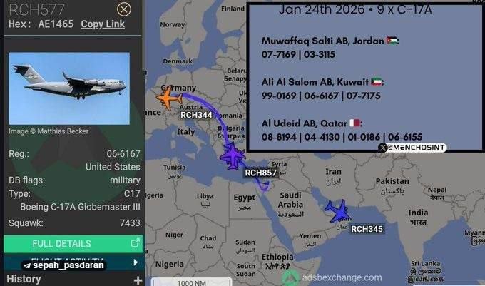 💬Over the past 24 hours, 9 American military transport aircraft have entered the Middle East region.