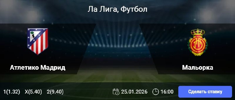 Статистика Атлетико Мадрид: Команда забивала в 21 из 22 последних матчей Примеры. С 17 пропущенными мячами оборона «Атлетико» является одной из лучших в лиге, наравне с «Реалом». В 13 из 15 последних домашних игр клуба в чемпионате было забито не менее двух голов. Статистика Мальорки: Команда пропускала в девяти из десяти последних выездных матчей чемпионата. Безвыигрышная серия клуба в гостях насчитывает пять встреч (две ничьи, три поражения). В шести из восьми предыдущих игр островитян в Ла Лиге было забито как минимум три мяча. 🎯 Фора 2 (+1.5) 🎲 кф (1.89) 👉 СДЕЛАТЬ СТАВКУ 🎁 ФРИБЕТ WINLINE - 3000₽ (промокод: BETWIN) 👉 СМОТРЕТЬ ПРОГНОЗ