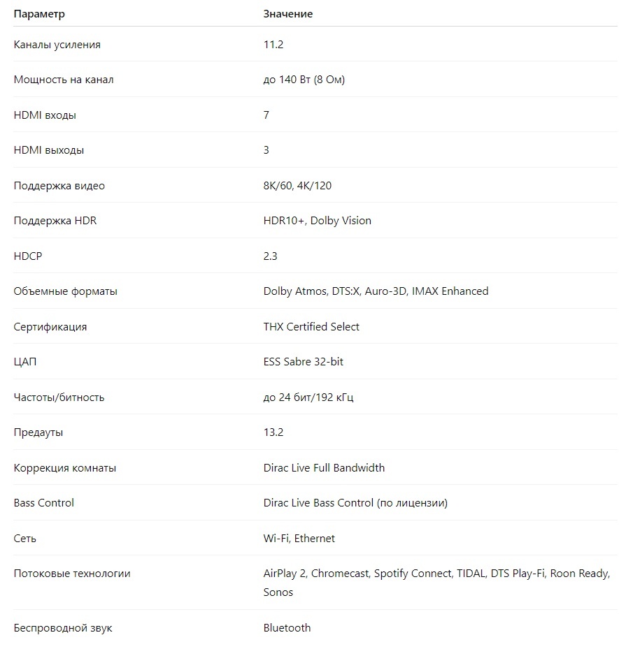 THX Certified Select гарантирует стабильность звука при высоких нагрузках. Ресивер справляется с системой 7.2.4 из коробки — без внешнего усилителя.
