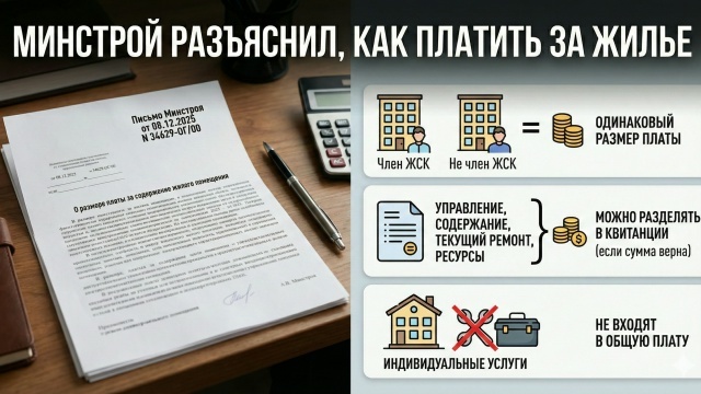 Минстрой решил разъяснить, как платить за содержание жилья. Сделал он это в письме от 08.12.2025 №34629-ОГ/00. Причем успел сразу на несколько вопросов ответить. 1. Если домом управляет ЖСК, то размер платы для членов ЖСК и лиц, членами ЖСК не являющимися, должен быть одинаковым. Для ТСЖ эта позиция давно закрепилась, по ЖСК, видимо, остаются вопросы. 2. Управляющие организации могут отдельно указывать "управление МКД", "содержание общего имущества в МКД", "текущий ремонт общего имущества в МКД", "коммунальные ресурсы, потребляемые при использовании и содержании общего имущества в МКД", при условии, что сумма всех компонентов равна плате за содержание жилого помещения, утвержденной в установленном порядке." Подписывайтесь на канал "ЖКХ: вопросы и ответы", ставьте лайки и делитесь нашими полезными статьями с друзьями, родственниками и в домовых чатах с соседями. Также не забывайте про премиум-подписку на наш блог. В этом разделе мы публикуем уникальные статьи и видео, которые больше ник