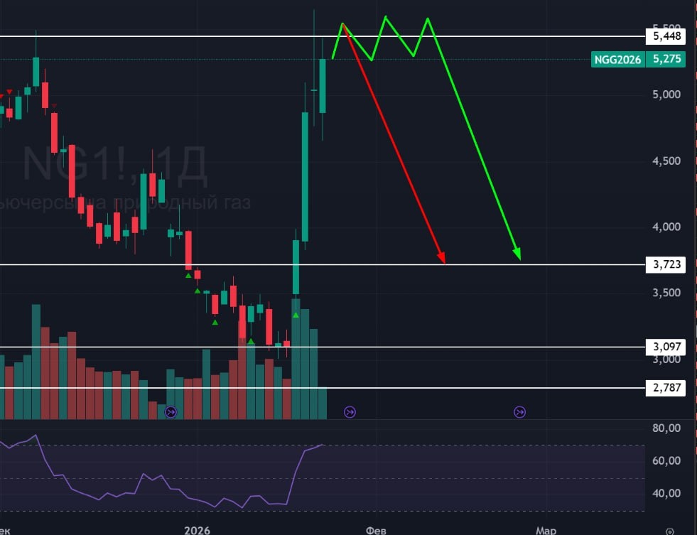 ⛽️ ГАЗ 🟢На самом деле, с газом всегда одно и тоже происходит из года в год. На лоях выходят статьи о том, что газ человечеству больше не нужен. А на хаях вечно какая-то поломка из-за погодных условий, или газ очень нужен ИИ для работы, короче, газ человечеству нужен и очень срочно. 🟢В утренних новостях паника: разобрали всю туалетную бумагу, скорая в каком-то городе застряла на летней резине, 276 тысяч домов остались без света, 3 бомжа замерзли, и так далее. Но в то же самое время, в этих же новостях пишут, что улучшение погоды будет на следующей неделе. 🟢Таким образом, легко сделать два вопроса и ответить на них себе: на чем дальше будет рост, если сейчас экстремальные погодные условия? Будет ли снежная буря длиться продолжительное время, месяц, например? 🚗 Так что в моих ожиданиях никаких изменений с момента прошлого поста. Цитирую: Жду скатывание газа вниз в ближайшее время. Не исключаю, что цену могут продержать наверху до экспирации, но если всех шортистов-котлетчиков уже