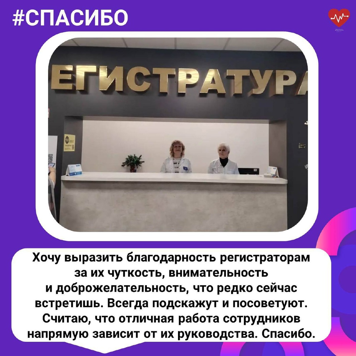 На этой неделе размещаем благодарность регистраторам поликлиники №5 Калужской городской клинической больницы №4 им. А.С. Хлюстина. Оставить благодарность медикам можно сканируя QR-код с помощью камеры вашего смартфона. Коды находятся на кабинетах врачей в поликлиниках и стационарах.