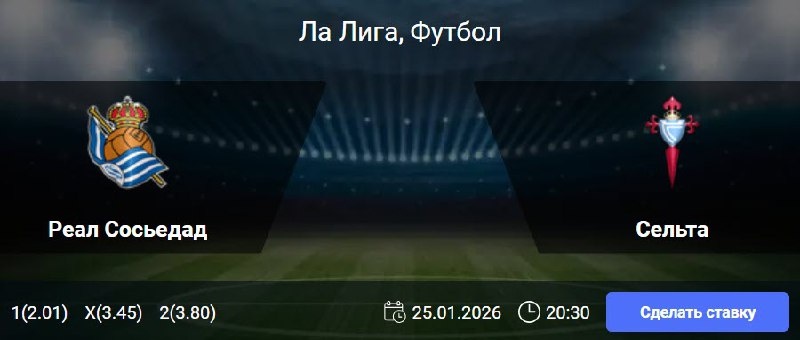 Статистика Реала Сосьедад: Стоит отметить, что оборона команды не отличается надежностью, пропуская голы в последних 14 матчах Примеры. В то же время, атака демонстрирует стабильность, забивая в пяти играх подряд. В целом, в последних 12 встречах Ла Лиги баски потерпели поражение лишь в трех из них. Статистика Сельты: Статистика подтверждает атакующую мощь галисийцев: они забивали в 19 из 20 последних выездных матчей чемпионата. При этом в семи из восьми предыдущих игр «Сельты» в Ла Лиге как минимум одна из команд не смогла отличиться. 🎯 Обе забьют (Да) 🎲 кф (1.84) 👉 СДЕЛАТЬ СТАВКУ 🎁 ФРИБЕТ WINLINE - 3000₽ (промокод: BETWIN) 👉 СМОТРЕТЬ ПРОГНОЗ