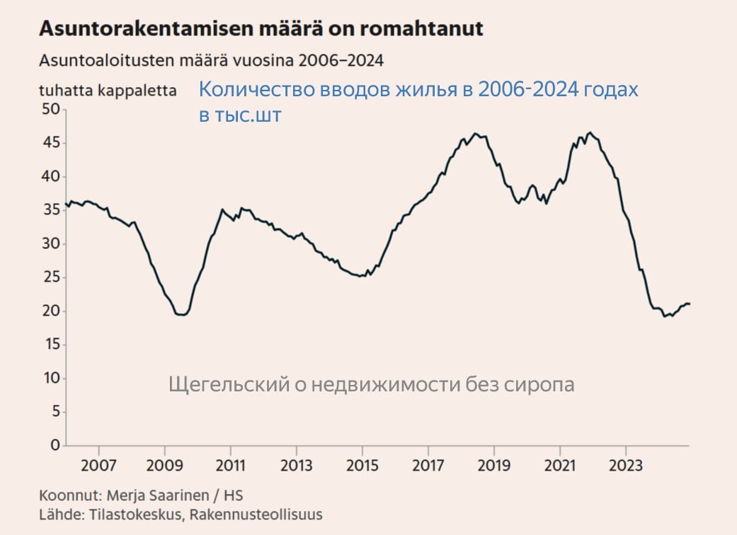 «Пока цены на старые дома падают, строительным компаниям экономически невыгодно строить новые. Сейчас цены резко упали», — говорит главный экономист строительной отрасли Финляндии.