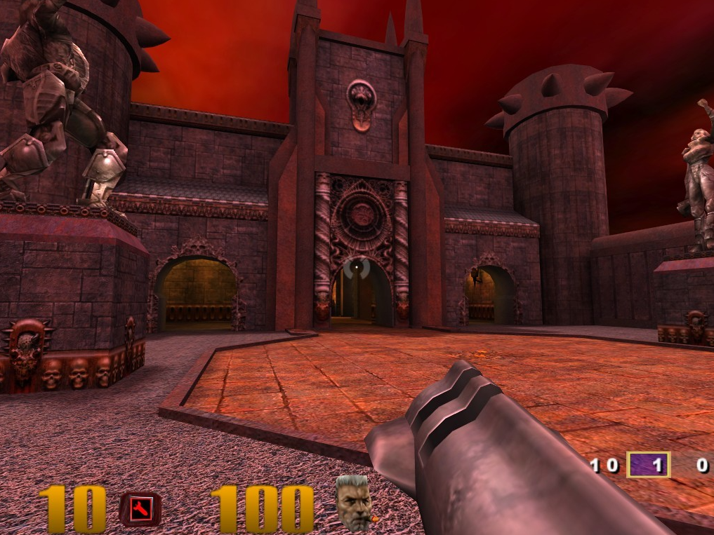 Сейчас знаю каждый угол. Каждый телепорт. Где лежит railgun (на верхней платформе — нужен rocket jump). Где mega health. Где красная броня.