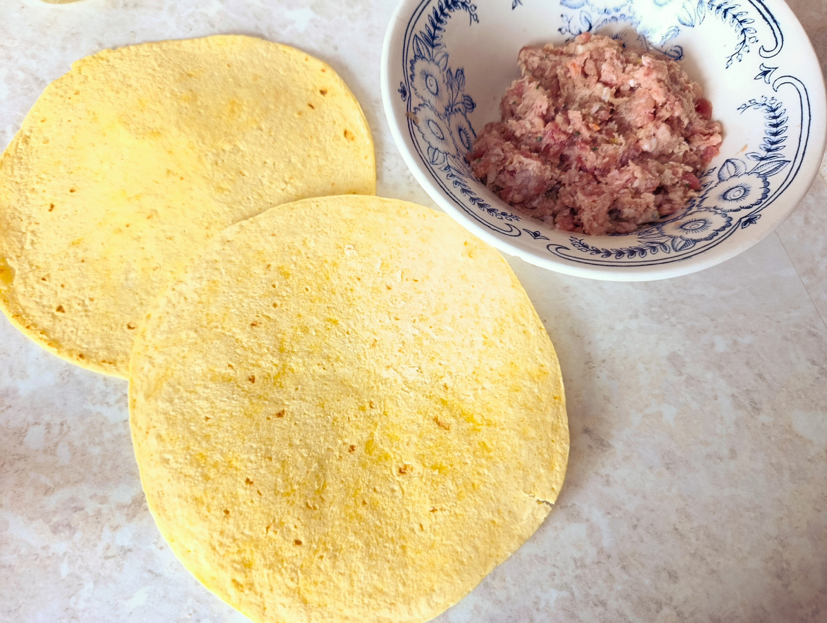 Сегодня поделюсь идеей, как приготовить вкусный завтрак или перекус. У меня он соорудился из остатков продуктов - залежалась пара сырных лепешек (тортильи) и после приготовления супа с фрикадельками осталось немного фарша.