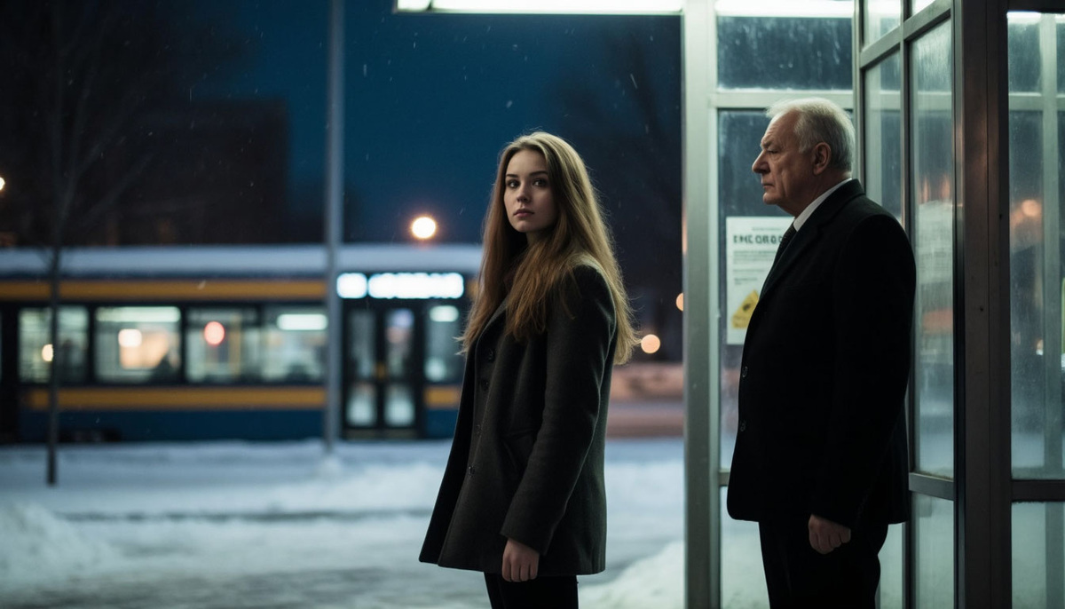 Он стоял в метре от нее, с краю остановки, будто возник из ничего. Высокий, худой старик в черном, как смоль, костюме. Костюм выглядел старомодным, но аккуратным, словно только что из химчистки. На ногах — черные туфли, не предназначенные для снега, но совершенно сухие. На голове не было шапки, седые волосы аккуратно зачесаны назад. И самое странное — он не дрожал от холода. Стоял совершенно неподвижно, глядя прямо перед собой, на дорогу.