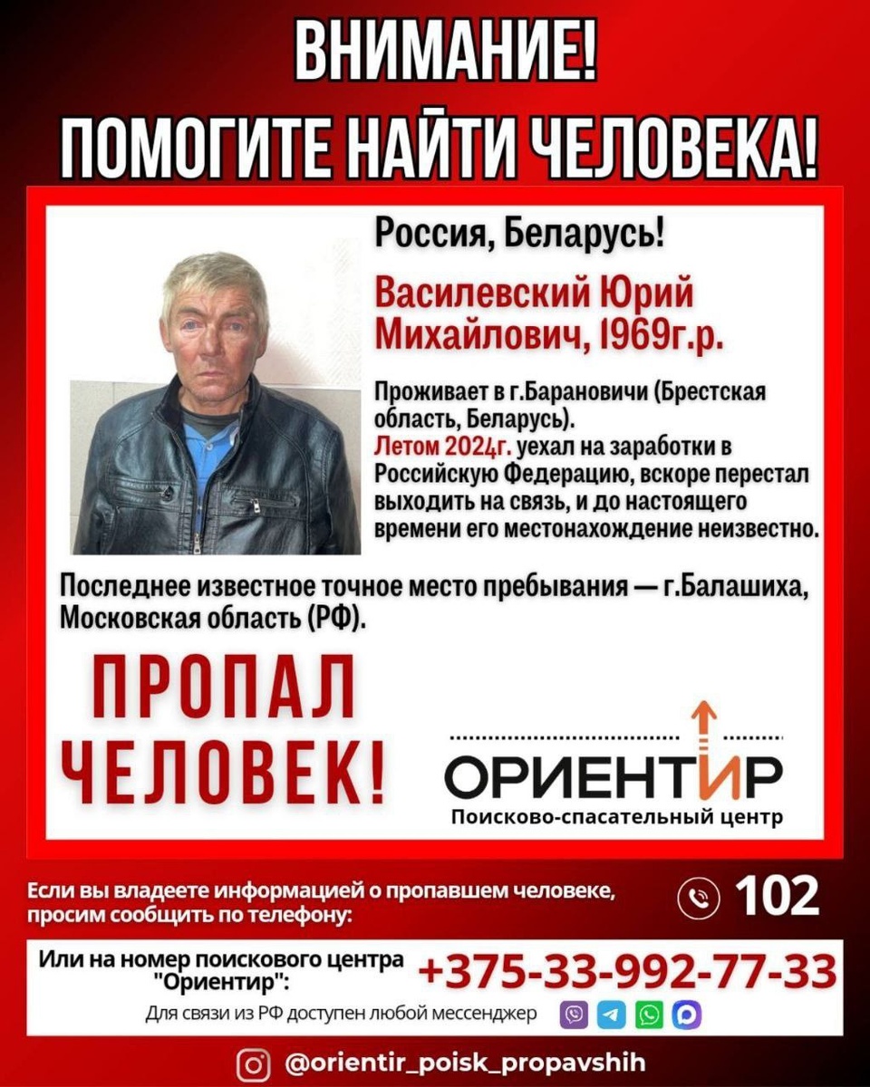 на заработки в Российскую Федерацию. Последнее известное местоположение - г.Балашиха. Предположительно мог направиться в - г.Реутов. Если Вы владеете какой-либо информацией о пропавшем - просьба сообщить по телефону +375(33)992-77-33 (любой из мессенджеров) или в сообщения профиля. С Уважением, Поисково-спасательный центр "Ориентир", Республика Беларусь. 🤩 Подписаться | Прислать новость | ВКонтакте | Дзен | OK | MAX | Чат