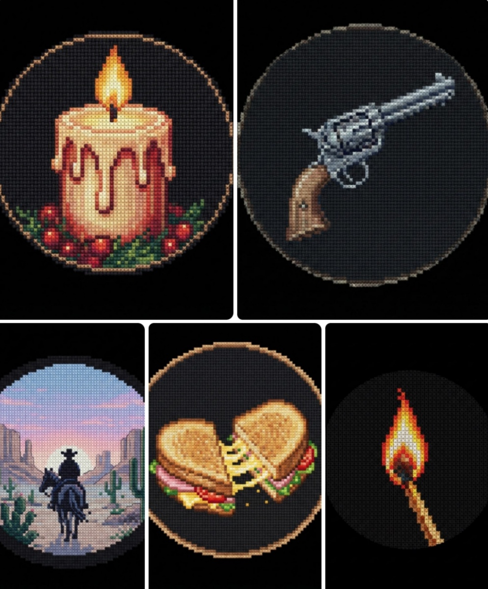 : Highly detailed digital illustration in 1:1 aspect ratio on a pure black background. The main object is [your object], rendered as a circular cross‑stitch embroidery made of tiny, clearly visible square stitches arranged on a dark fabric grid. Use a pixel‑art style with a limited but vibrant color palette, where each stitch is a distinct colored square that builds up the image, including subtle shading and highlights. The edges of the circle are slightly irregular and textured from the stitches, giving a handmade, tactile feel, while the background remains flat black. No text, no logos, no additional background elements. #артпромпт@bestpromptai