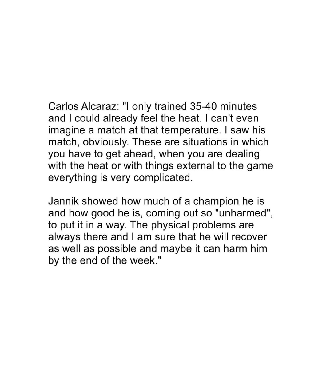: "Я тренировался всего 35-40 минут и уже чувствовал жару. Не могу даже представить себе матч при такой температуре. Я видел его матч, конечно. Это ситуации, в которых нужно вырываться вперед, когда имеешь дело с жарой или с вещами, внешними по отношению к игре, все очень сложно. Янник показал, насколько он чемпион и насколько он хорош, выйдя таким "невредимым", так сказать. Физические проблемы всегда есть, и я уверен, что он восстановится как можно лучше, и, возможно, это повредит ему к концу недели". Подпишись на Эйс и точка