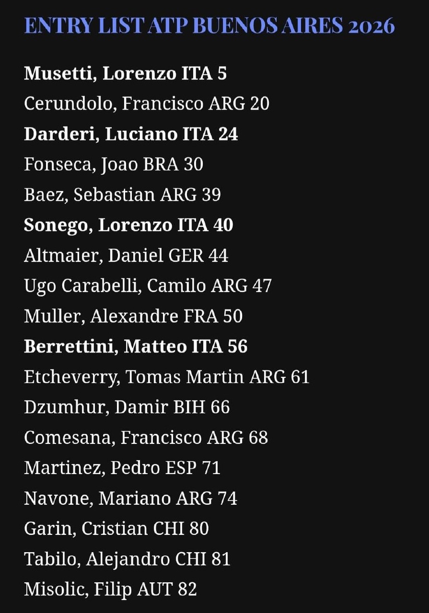 🎾🇦🇷 В основном списке: Музетти, Черундоло, Дардери, Фонсека, Баес, Сонего, Альтмайер, Карабелли, Мюллер, Берреттини, Этчеверри и другие. В квалификации: Хуан Мануэль Черундоло, Нава, Дьере, Табернер, Копршива, Буручага и другие. Болельщики в Буэнос-Айресе очень шумные! 😂 Забавный факт с Australian Open: Уго Карабелли в свои выходные между парными матчами тренировался на грунте. 🤯 Подпишись на Эйс и точка