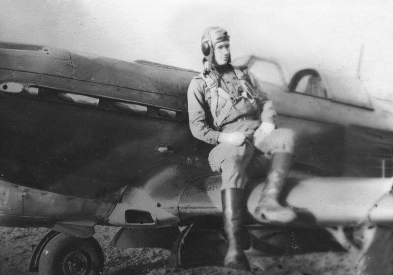 Капитан Павел Павлович Калюжный (1916 — 2002) сидит на крыле своего истребителя Як-7б
