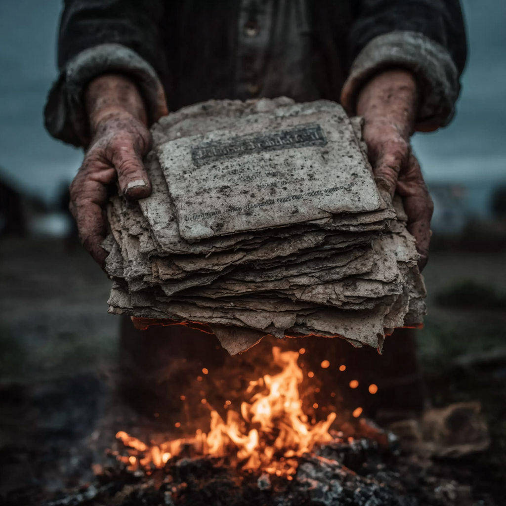 Она закрыла крышку сундука. Замок щёлкнул с тихим, окончательным звуком. Потом она подошла к жаровне. Взяла спички. Чиркнула. Огонь вспыхнул ярко, жадно, принявшись за газету и щепки. Пламя было живым, оранжево-жёлтым, танцующим на морозном воздухе.