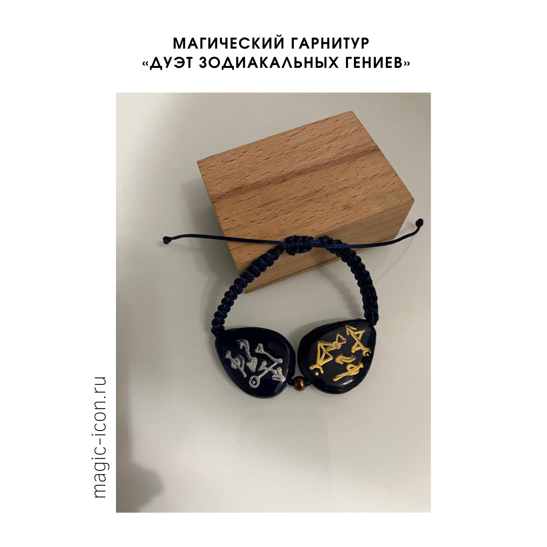 Серия "Эксклюзив" Только на заказ. Талисман на фото продан и находится в частной коллекции. Подобный талисман можно заказать, написав нам в личном сообщении. «Дуэт Зодиакальных Гениев» — это магический гарнитур для тех, кто осознанно работает с энергиями Разума, интуицией и ментальной защитой. Он объединяет в себе два талисмана с Печатью Зодиакального Гения и Сигилой Духа помощника, настроенных на работу с ментальными каналами, памятью и высокочастотными информационными потоками. Что такое «Дуэт Зодиакальных Гениев» «Дуэт Зодиакальных Гениев» представляет собой браслет плетения шамбала, в котором соединены два отдельных талисмана на бусинах синего агата: • талисман «Светлая голова» от Зодиакального Гения Хила (12 мая, 22° Тельца); • талисман «Ментальный ускоритель» от Зодиакального Гения Нотизера (22 сентября, 29° Девы). Оба талисмана несут в себе магические формулы, нанесённые методом ментальной графики (ментальной графической алхимии) на поверхность синего агата, что позволяет выст
