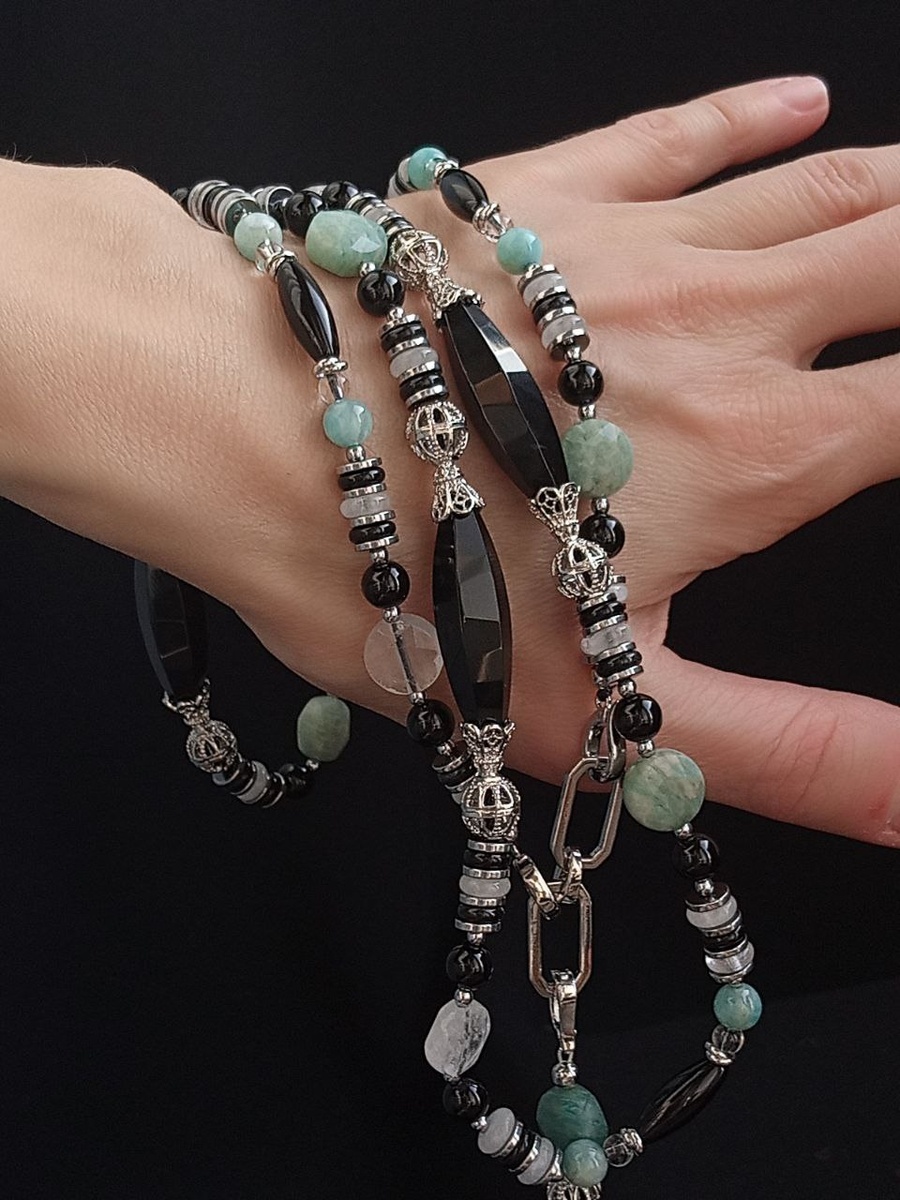 92 см, собрано на нить ручной вязки — мягкое, подвижное, удобное в носке 💫 В основе — игра трёх оттенков: — акцентный чёрный агат, глубокий и сдержанный, — нежный цвет Тиффани амазонита — мягкий бирюзово-зелёный с белыми прожилками, — прозрачный горный хрусталь, который усиливает свет и объём ✨ Камни — с ювелирной огранкой: каждая грань ловит свет и раскрывает характер камня. Бусины разной формы: шарики, рондели, гранёные таблетки и удлинённые гранёные бусины — создают ритм и живую фактуру. Фурнитура — серебристая, с родированным покрытием. Замочек — выразительный, надёжный 🔒 А между камнями — роскошные резные серебристые элементы: изящные, с чётким рельефом, будто миниатюрные украшения сами по себе. 🔹 Съёмная подвеска — 7 см Её можно: — носить на этом колье, — или отдельно — на любой цепочке. Два украшения в одном 💎 Это колье — и для повседневности, и для выхода: чёрный делает его универсальным, а огранка и резные детали — изысканным. 💰 Цена — 6500 ₽ 💎 В наличии Все гото