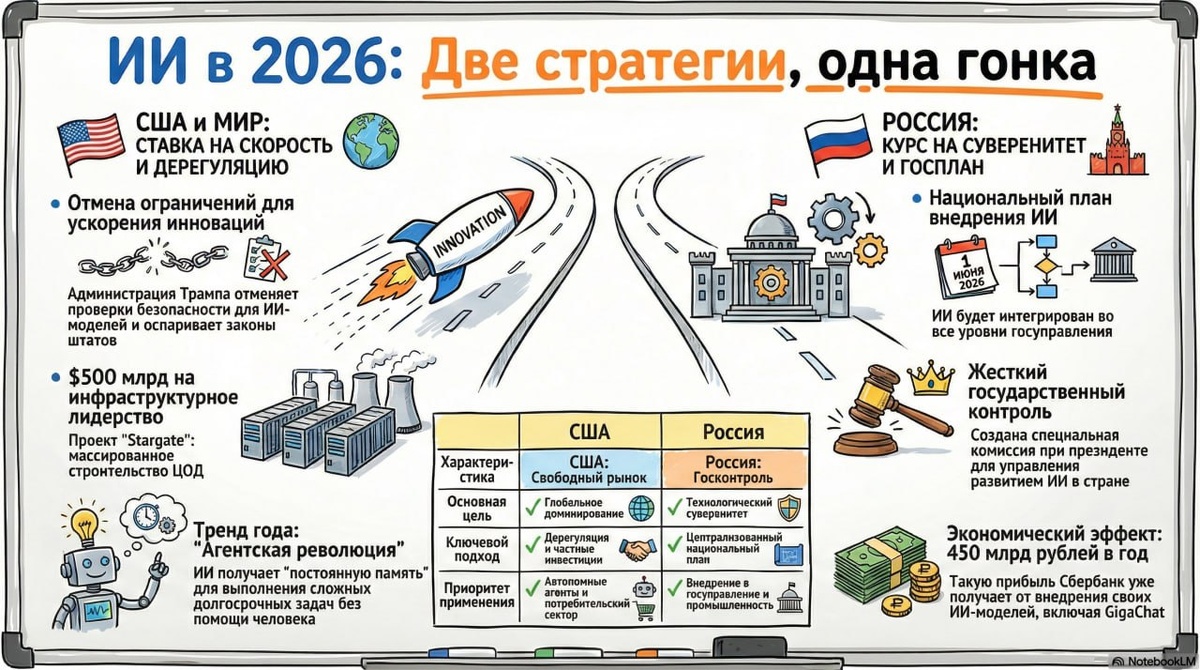 Эта неделя января 2026 года стала поворотной: мир окончательно переходит от «болтливых» чат-ботов к агентному ИИ, способному к самостоятельным действиям. Геополитически мы наблюдаем полярное расхождение стратегий: пока США при Трампе сносят любые барьеры ради скорости, Россия строит жесткую вертикаль суверенного ИИ. 🌍 Мир: Эра агентов и «минимального вмешательства» Главный технологический тренд — Agentic AI. Нейросети больше не просто отвечают на вопросы, они выполняют работу. IBM и другие гиганты внедряют системы, которые сами управляют рисками и корпоративными политиками, а новые модели (вроде GPT-5.2 «Thinking») демонстрируют качественный скачок в логике и планировании. Apple, признав отставание, интегрирует Google Gemini в ядро Siri, чтобы дать айфонам настоящий интеллект. Политический вектор в США резко сменился. Администрация Дональда Трампа провозгласила курс на радикальную дерегуляцию. Создана спецгруппа Минюста (AI Litigation Task Force), которая через суды отменяет закон
