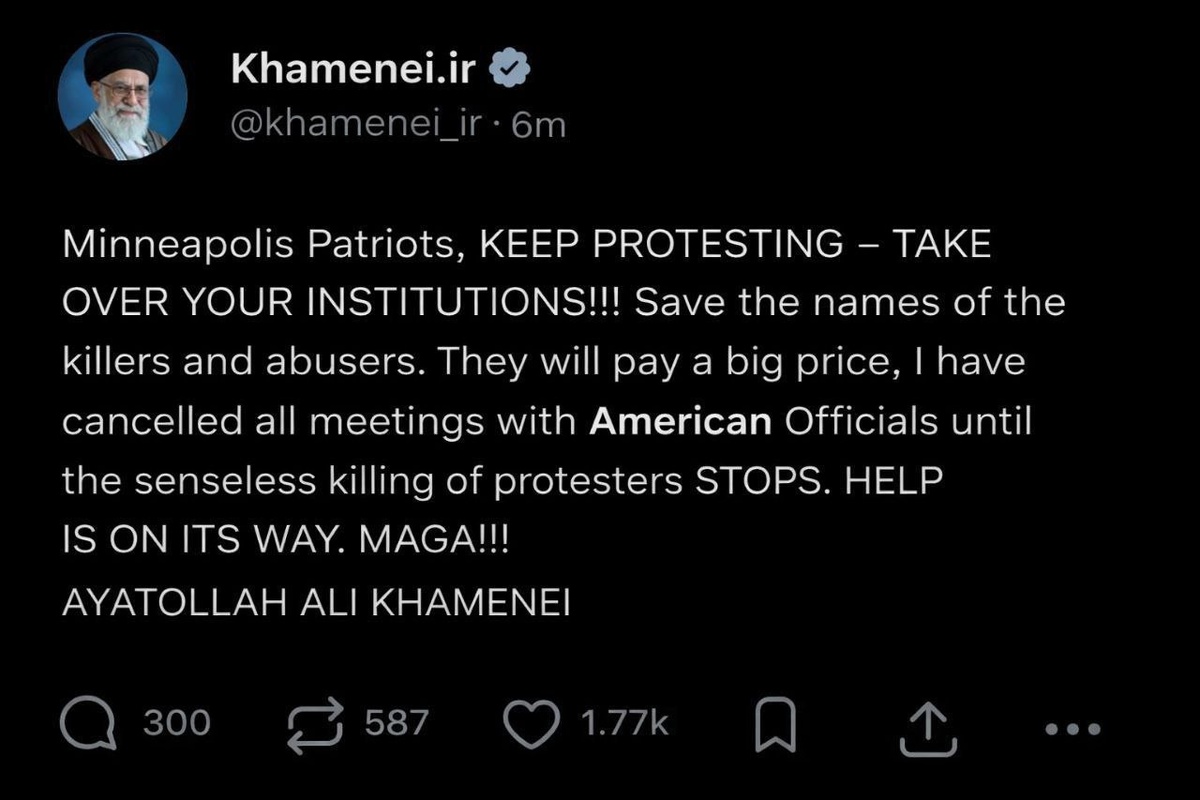 Иран решил дать ответку. Патриоты Миннеаполиса! ПРОТЕСТУЙТЕ! ЗАХВАТЫВАЙТЕ УЧРЕЖДЕНИЯ! Запоминайте имена ваших убийц и притеснителей! Они за все заплатят! Я отменил все встречи с американской стороной до тех пор, пока эта бессмысленная бойня не прекратится! Помощь уже в пути! MAGA! Аятолла Али Хаменеи. В ближайшее время, Иран явно обвинит США в убийствах мирных жителей. Ведь лучшая защита это нападение. Тем более, что основания для этого имеются.