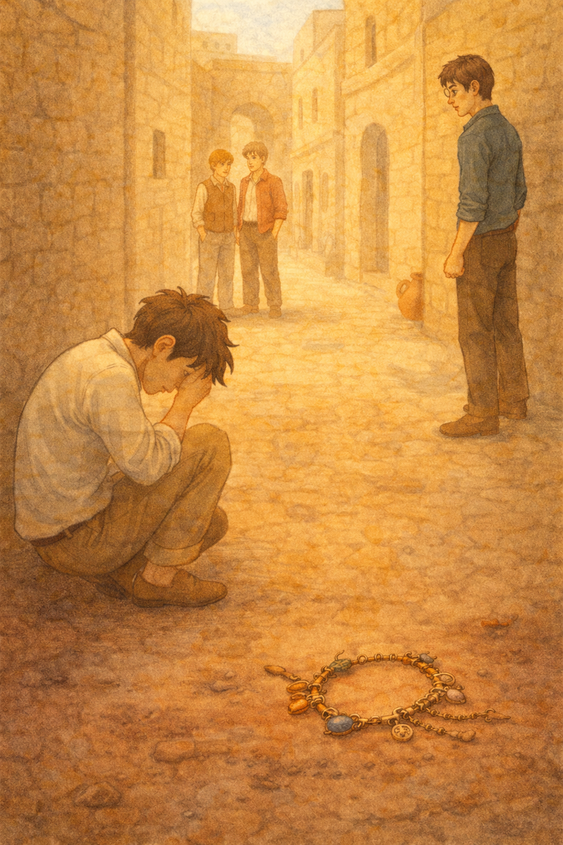 Противник Кенты, побитый, весь в крови, сумел-таки выползти из-под громилы и бросился в противоположную от гостиницы сторону. Воин-майнэсу с ревом кинулся за ним, но беглец успел уйти с места преступления. Барьер, отделяющий поле боя от всей остальной Сарды, растаял, и остальные путешественники сумели попасть на середину улицы. Лу со всех ног подскочил к Олли, стоящему на коленях у того места, где только что держали Нику. На земле валялся разорванный браслет, подвески, висевшие на нем, слетели и были слегка утоптаны в землю.