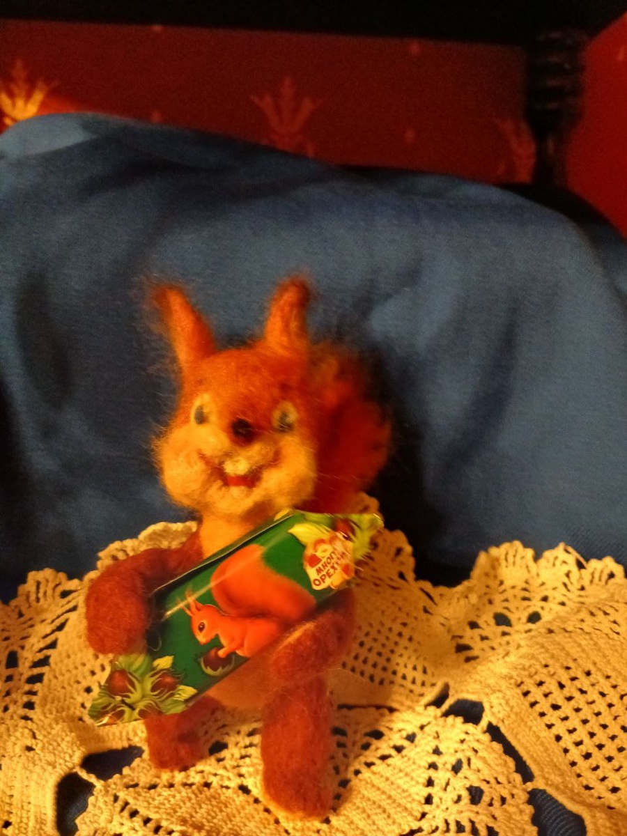 Здравствуйте, мои терпеливые и верные друзья! Не так уж долго я томила вас в ожидании очередной странички. Просто, я не могу ни о чём писать если нет материала для показа. Просто так "Растекаться мыслью, вернее, мысью, по древу", я не умею. Вот показать результат работы мне всегда кажется правильным. Тут алгоритм подчеркнул слово "мысью". А ведь слово мысь в переводе с древнерусского означает белка. Белка сегодня и является героиней моего рассказа и показа. Почти везде у Владимира Зарубина встречается рисунок этого симпатичного зверька. Зарубин сделал этот образ настолько забавным, что улыбка появляется на лицах у всех, кто видит белочек на открытках. Хоть белка неизменный персонаж Новогодних открыток, наряд у неё не зимний ,а летний. Я понимаю художника. Гораздо ярче и интересней смотрится рыжий зверёк. В воспроизведении этой фигурки из шерсти, несомненно, были сложности. Но мне очень помогло то, что белочки на открытках были нарисованы в каком- то постоянном движении и разных позах.