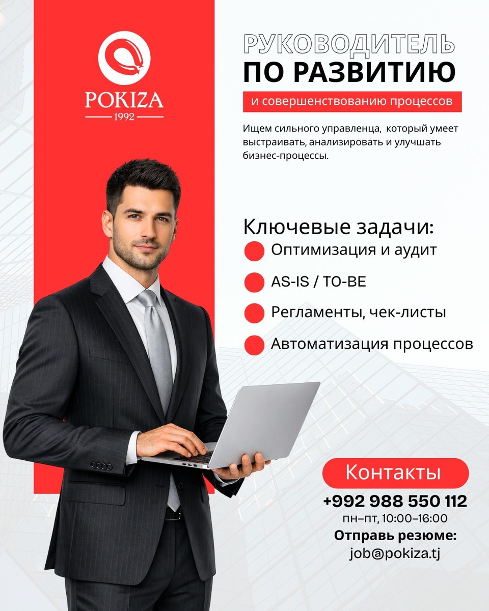 : 🔹 Руководитель по развитию и совершенствованию процессов 🔹 Мерчандайзер Мы — крупнейшее производство в сфере птицеводства, мясных, колбасных изделий и полуфабрикатов. Приглашаем профессионалов, готовых развиваться вместе с нами. Мы предлагаем: ✔️ Стабильную работу в крупной компании ✔️ Конкурентную заработную плату без задержек ✔️ Корпоративную мобильную связь ✔️ Обучение и возможности карьерного роста ✔️ Корпоративную библиотеку ✔️ Для офисных сотрудников — бесплатные завтраки и обеды 📩 Резюме отправляйте на job@pokiza.tj 📝 В теме письма обязательно укажите название вакансии 📞 Звонки принимаются Пн–Пт с 10:00 до 16:00 988550112 Стань частью команды «Покиза», где качество — это стиль жизни.