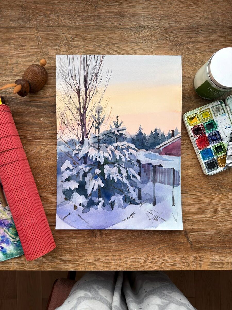 Пока была на даче сделала небольшую акварельную зарисовку вида из окна