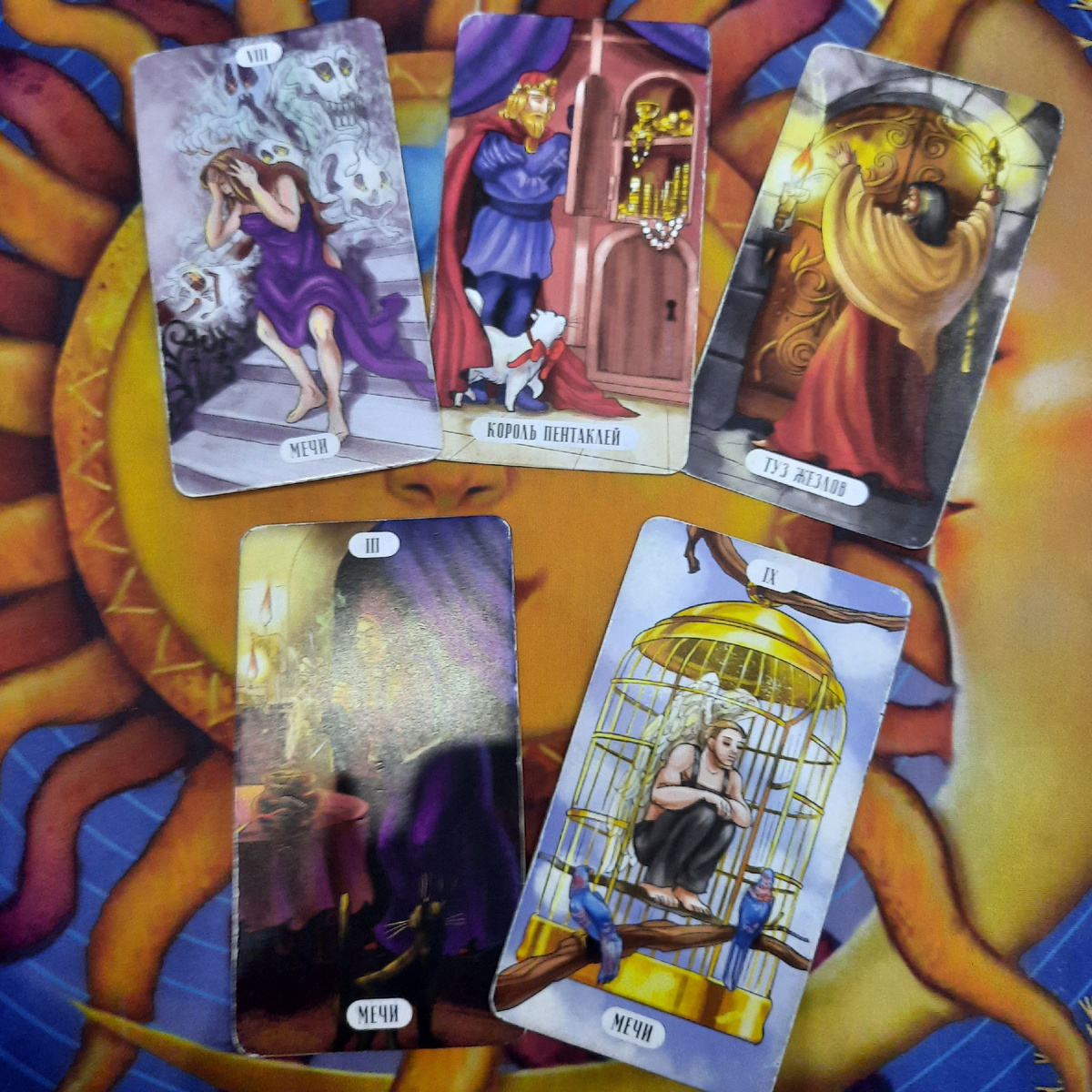 Ваши мысли , ваши сомнения, ваши переживания, которые связаны с королём Пентаклей , это может быть кем угодно для вас человек, все эти мысли приводят вас к тому что вы сами себя запираете в клетке. Получается, что вы перекрываете себе дороги , это может выглядеть так что вы что-то хотите делать , но ограничивайте себя. И тем самым сами себе приносите дополнительные переживания, терзания.