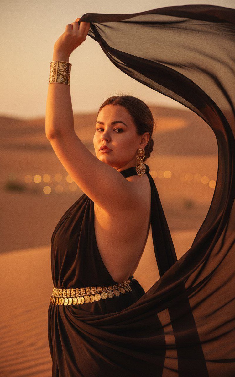драпированном платье/сари с открытой спиной, поднятая рука держит прозрачное чёрное полотно, золотой час — тёплый боковой рим-лайт, мягкие насыщенные тёплые тона, размытый пустынный фон с сильным боке. Роскошные золотые украшения: массивный браслет, пояс с монетами, крупные серьги; акцент на текстурах ткани, коже и металле. Насыщенный контраст, мягкие тени, тонкая зернистость пленки, фотореалистичная детализация, shallow depth of field, 85mm, f/1.8, cinematic color grading (orange + bronze), editorial fashion vibe, elegant, dramatic, dynamic fabric movement, high resolution, ultra-detailed." Опционально добавить negative prompt: "no text, no watermark, no extra people, no logos, no harsh overexposure." #женские@annapromtii20