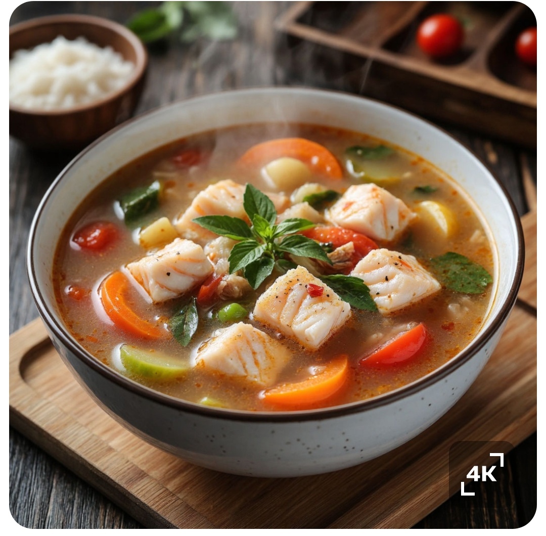 Подавайте суп горячим, дополнив ломтиками лимона для яркости вкуса. Этот суп — воплощение гармонии речной рыбы, насыщенных овощей и воздушного кускуса, который напомнит о спокойствии и красоте природных просторов.