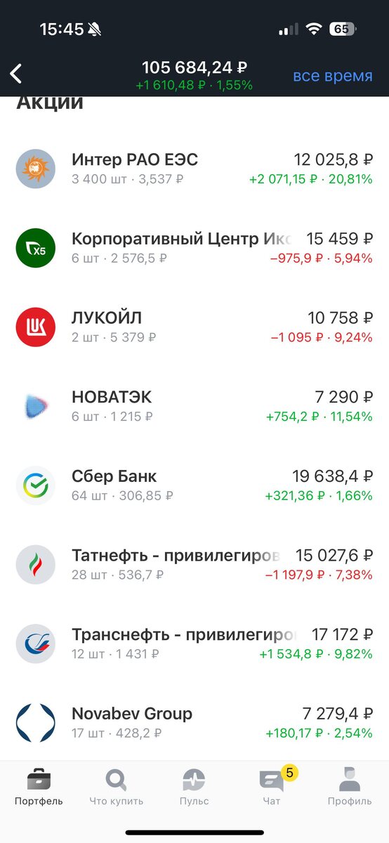 День #279 💰 Всех приветствую! На улице солнечная зима, а я продолжаю заниматься пополнениями своего брокерского счета 💵 Пополнил свой счет на 900 руб., за вчера и сегодня, чтобы завтра приобрести еще одну акцию Транснефти ⛽️, тем самым продолжаю увеличивать свой будущий пассивный доход, в планах иметь 30 акций до летних выплат, пока что у меня их 12 шт, но это исправимо Время проверить как изменился прогнозируемый пассивный доход по моему портфелю : 18.01.2026 - 12 329 руб/год или 1 027 руб/мес 25.01.2026 - 12 806 руб/год или 1 067 руб/мес Путь к 2 000 руб/месяц - полноценно открыт! Ожидаемые дивиденды за год продолжают расти, но не просто сами по себе, а с помощью ежедневного инвестирования, этот рост хоть и по чуть-чуть, но прибавляется каждую неделю - это меня мотивирует действовать дальше, а дальше больше! Всем отличного морозного дня и прекрасного настроения! ❤️ Ссылка на чат канала - присоединяйтесь • Стоимость портфеля: 105 684.24 руб. • Сумма вложений: 100 700 руб. • Див