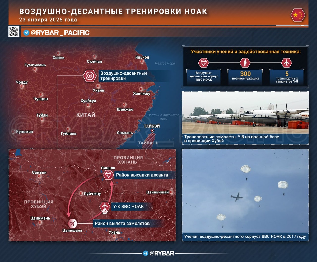 🔸Китайцы продолжают проводить военные тренировки, так или иначе связанные с потенциальным конфликтом в Тайваньском проливе. 23 января воздушно-десантный корпус Народно-освободительной армии Китая организовал учения, в которых приняли участие около 300 военнослужащих. 🔸Во время маневров задействовался транспортный самолет Y-8, вылетевший вместе с личным составом с базы в Цзиншане. Высадка десантников производилась на тренировочном полигоне «Синьян», расположенном в соседней провинции Хэнань. 🔸Если в Китае будут решать тайваньский вопрос силовыми методами, у военного руководства в Пекине будут большие надежды на воздушно-десантный корпус. Китайцы однозначно вынашивают планы по проведению обезглавливающих операций — и они начали появляться задолго до американской операции в Венесуэле. 🔸Например, в 2021 году китайские десантники из подразделения специального назначения проводили учения, во время которых отрабатывался захват высокопоставленных целей в условиях высадки на остров. Вероятн