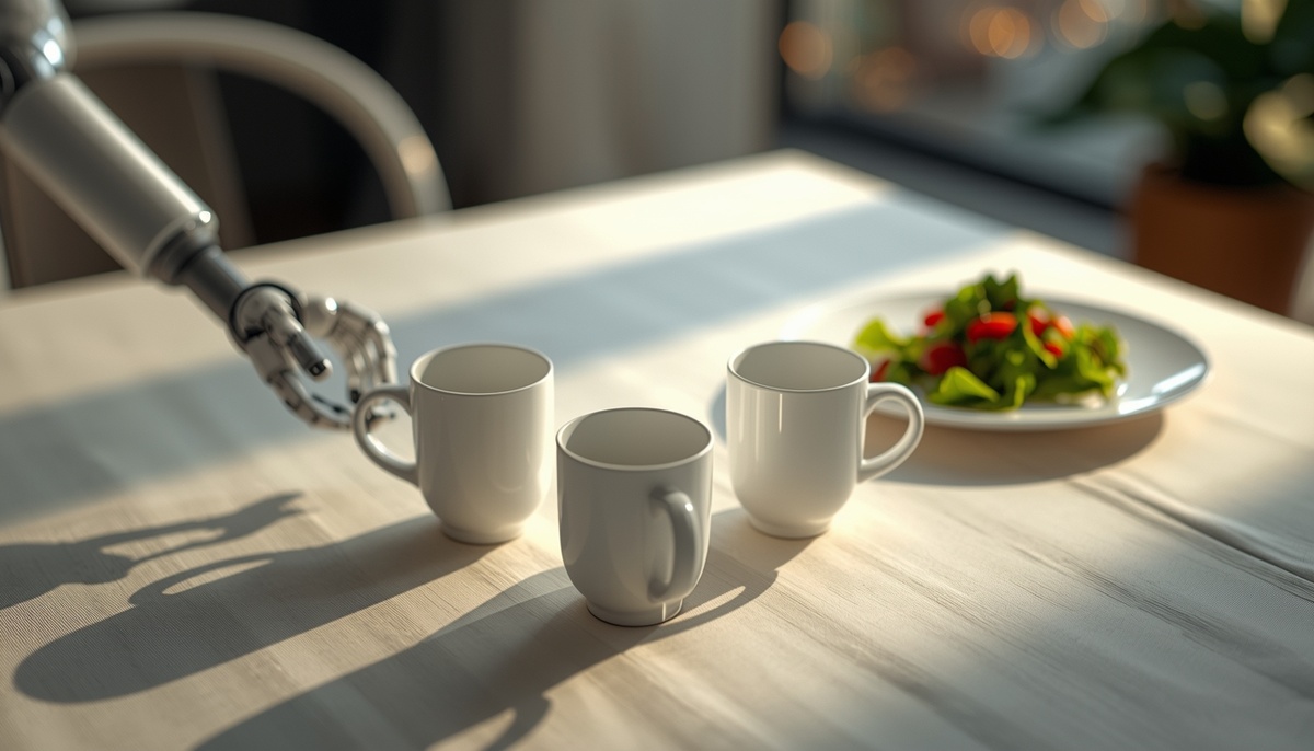Но настоящий удар ждал ее на обеденном столе. Его уже накрыл сервировочный робот «Лакей» – тонкий столбик на гусеницах с тремя изящными манипуляторами. Скатерть, салфетки, столовые приборы – всё лежало с геометрической точностью. И чашки. Их было три. Белоснежные фарфоровые чашки, расставленные по идеально ровному треугольнику.