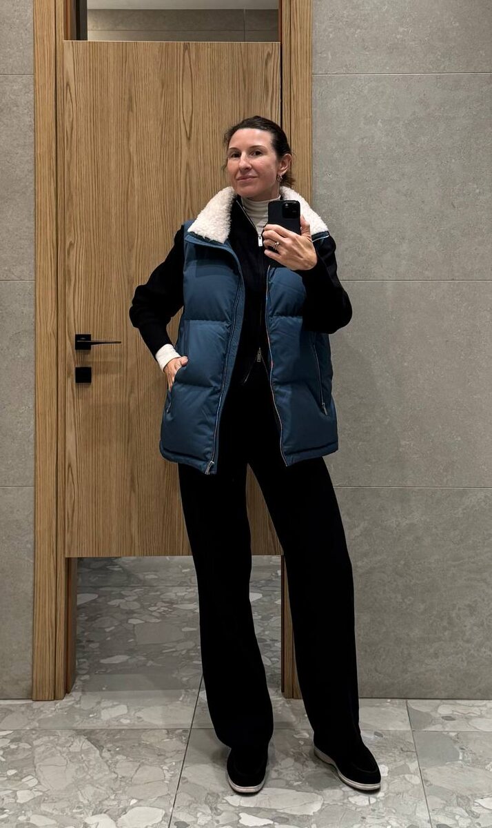 Здесь нет «главной вещи», но есть баланс: чёрный создаёт вертикаль и собирает силуэт, светлый слой у лица освежает и добавляет глубины, жилет вводит цвет и объём, не разрушая пропорции. В повседневных комплектах важно не количество акцентов, а их функция. Каждый элемент здесь что-то делает: — верхняя фактура добавляет рельеф — светлая зона у лица даёт контраст — строгая сумка удерживает образ во взрослой плоскости Так выглядит продуманный casual: когда удобно, но нет ощущения случайности.