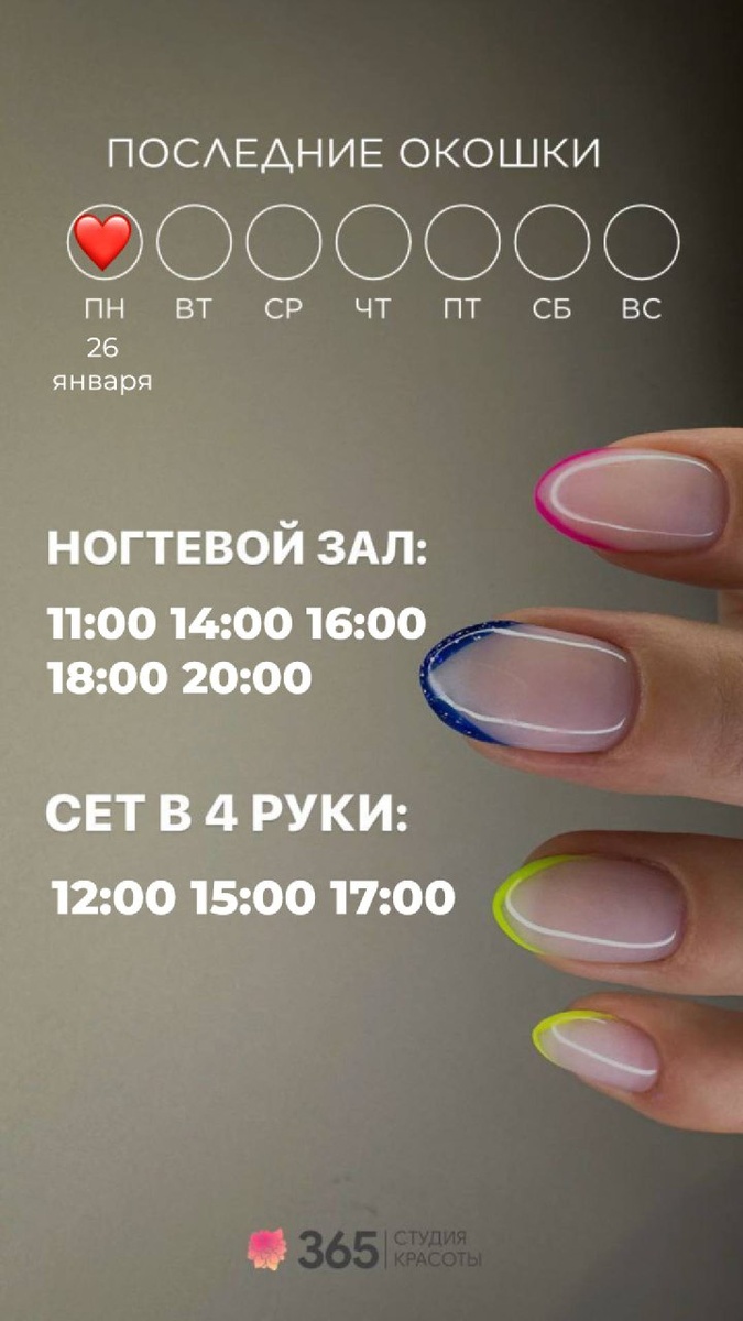 ❤ Пусть новая неделя принесет радость 😄😍, счастье, красоту! Творите, создавайте, верьте...💫 Студия 365 - ждет каждую за преображением! 🥰 #красота #наслаждение #забота #зима #любовь #мечты сбываются #радость #возможности ЧТО МОЖНО УСПЕТЬ СДЕЛАТЬ 26 января 2026 года: Ногтевой зал: 11:00 14:00 16:00 18:00 20:00 Сет в 4 руки: 12:00 15:00 17:00 Парикмахерский зал: 10:00 Оформление бровей и ресниц: ближайшая запись на 29 января Косметология/шугаринг: 12:00 15:00 16:30 ЗАПИСАТЬСЯ МОЖНО ЛЮБЫМ УДОБНЫМ СПОСОБОМ: 👉🏻 Сообщение в Whats'app https://wa.me/79663654477 👉🏻По телефону +79663654477 👉🏻Онлайн запись https://n286444.yclients.com/ #команда365 #красота #наслаждение #забота #зима #январь #любовь #мечтысбываются #радость #возможности