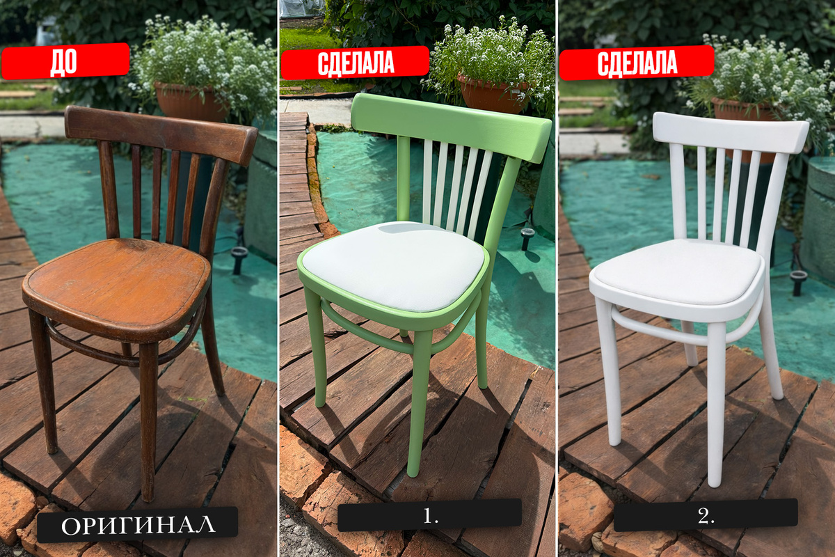 Ребята, хочу спросить ваше мнение 💭 Со стульями у меня получился целый эксперимент. Я перебрала около 10 вариантов расцветок, примеряла их мысленно к дому, к настроению, к свету — и в итоге в жизни реализовала только два варианта, которые вы уже видели. Но! В процессе было гораздо больше идей, и сегодня хочу показать вам все расцветки, которые были в разработке, и обсудить каждую отдельно — как маленькую историю. Оригинал — коричневый Это тот самый стул, с которого всё началось. Классический, тёплый, немного винтажный. У него уже есть характер и своя история. Именно он стал отправной точкой для всех экспериментов. 1. Салатовый + бежевые сиденье (✅ реализован) Этот вариант я в итоге воплотила в жизнь. Очень свежий, лёгкий, летний. Он идеально вписался в пространство и дал то самое ощущение «воздуха» и уюта одновременно. 📎 Есть видео с процессом и результатом — на канале. Можно посмотреть, как он выглядит в готовом варианте. в ВК https://vk.com/clip-221659340_456239206 2. Полностью б