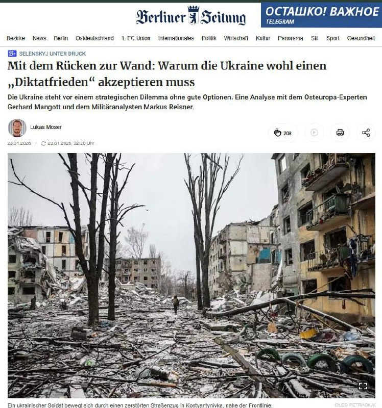 Газета Berliner Zeitung пишет, что ситуация для Украины становится очень тяжёлой. Издание заявляет: армия устала, помощь от союзников замедляется, а хороших вариантов для выхода из войны почти не осталось. Аналитик Герхард Манготт заявил: чтобы остановить войну, Киеву, скорее всего, придётся согласиться на жёсткие условия — отказаться от части территорий и от планов вступить в НАТО. По его словам, время и ресурсы на сопротивление заканчиваются. Официальная позиция Украины остаётся прежней: переговоры — только на своих условиях, с восстановлением границ. США и ЕС публично продолжают обещать поддержку, но в статье делается намёк, что в реальности запал у западных партнёров ослабел. 📱телеграм-канал Херсонский Вестник 🌐группа VK Вконтакте