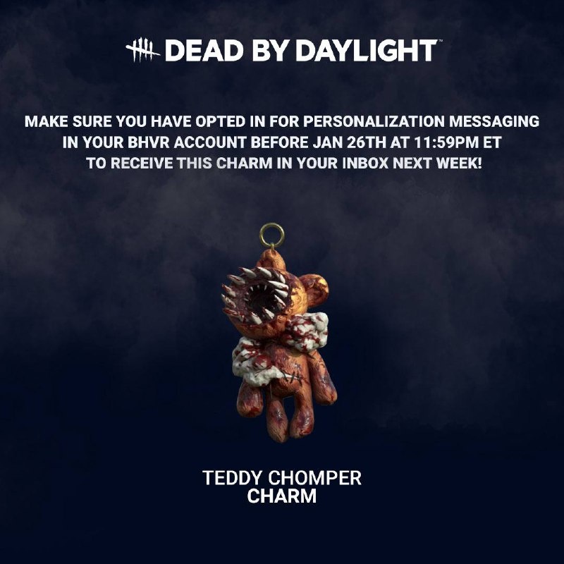 🧸 Создайте учетную запись BHVR (если у вас ее еще нет) и убедитесь, что вы подписались на персонализированные сообщения до 26 января, чтобы получить этот амулет «Мишка-пожиратель» в свой почтовый ящик на следующей неделе. 🔪 Подписаться | ⚡️Голосовать #deadbydaylight #дбд #dbd #news #dbdnews #новостидбд
