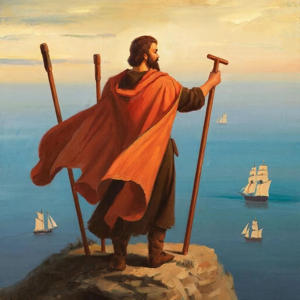 Взгляните на образ этой карты. Наш герой стоит на высоте, опираясь на два жезла, а третий он держит в руке, глядя вдаль на корабли, которые отправляются к горизонту.