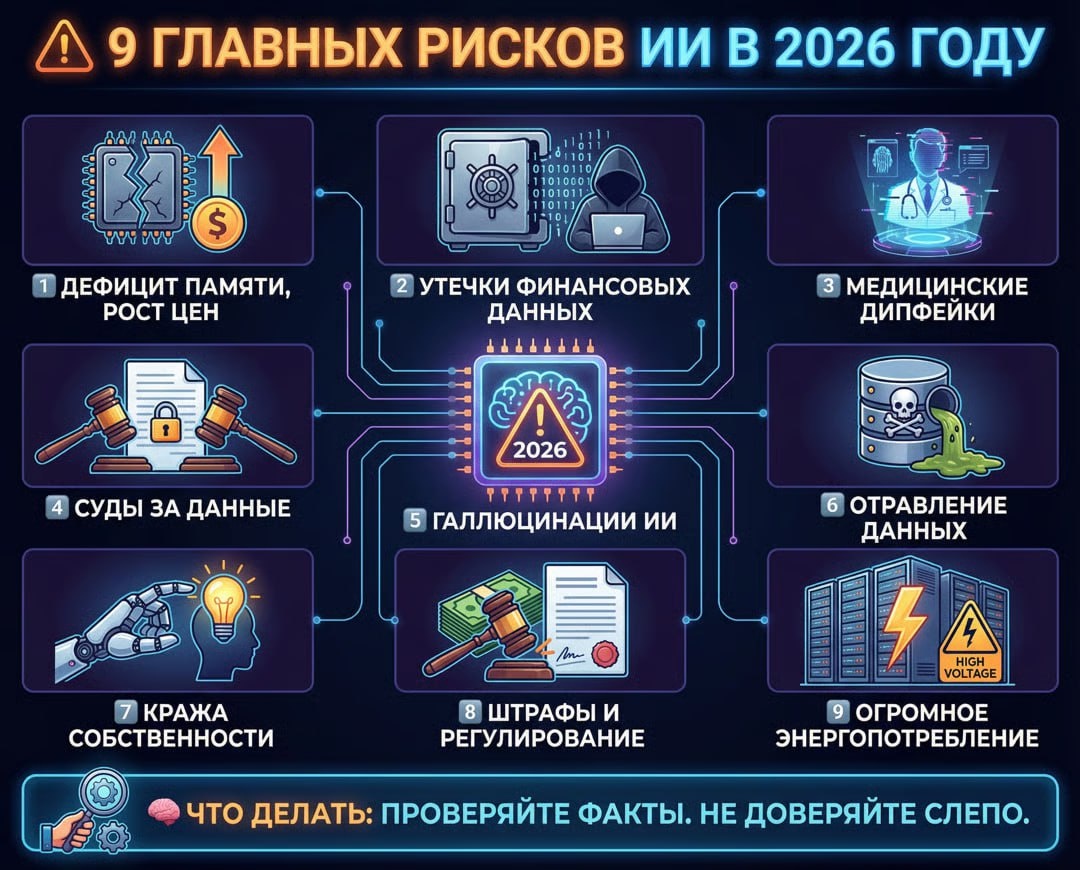 ) Свежий обзор от января 2026 показывает: ИИ мощный инструмент, но с побочными эффектами. Ниже — основные риски, о которых важно знать обычным пользователям и бизнесу. 1️⃣ ИИ может подорожать из-за нехватки памяти Производители чипов, включая Micron, предупреждают: специализированной памяти для ИИ не хватает, и дефицит затянется после 2026 года. Это значит рост цен на ИИ-сервисы. 2️⃣ США стали центром ИИ в финансах Около 44% мировых сделок по ИИ-финтеху сосредоточены в США. Чем больше ИИ в банках и платежах, тем выше риск утечек данных. Банковский чат-бот знает о вас всё, а хакеры — тоже хотят. 3️⃣ ИИ в медицине может вводить в заблуждение ИИ всё активнее используют фармкомпании и клиники, но растёт и число фейков. Deepfake-видео «врачей» и ошибочные рекомендации ИИ реальная проблема. Пример: вы смотрите видео с «доктором», а это подделка. 4️⃣ Юридические войны из-за ИИ Компании вроде Clio уже судятся из-за кражи данных и идей. ИИ-сервисы могут «заимствовать» чужие тексты и ре