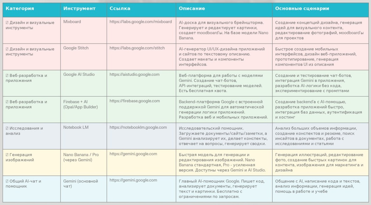 лидерами рынка. Пример задач для турагентства 🎯 Для веб-сайта турагентства: Notebook LM → Быстро анализировать информацию о туристических местах, создавать описания туров и контент на основе исследований Gemini → Написание маркетинг-текстов, описаний туров, ответы клиентам через интеграцию в чат-бот Google AI Studio → Разработать чат-бота для консультаций туристов прямо на сайте (через Gemini API) 🎨 Для визуального контента: Mixboard → Создание красивых moodboard'ов для каждого направления, обложки для туров, визуальный контент в соцсети Nano Banana (через Gemini) → Быстрая генерация дополняющих изображений, иллюстрации для постов и материалов 📱 Если нужны мобильные приложения: Google Stitch → Быстро спроектировать UI мобильного приложения для бронирования (в помощь дизайнерам) Firebase + AI → Разработать backend для приложения (базы данных клиентов, система платежей, отслеживание бронирований) 📊 Для анализа и документации: Notebook LM → Вести исследования по новым направл